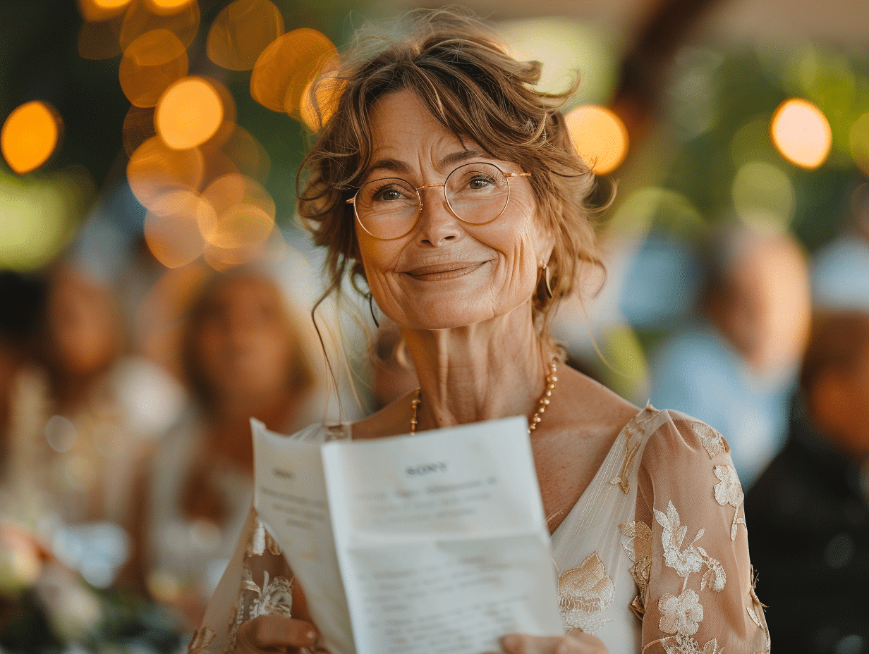 Préparez votre intervention avec autant de soin que vous en mettriez dans un cadeau précieux. Le discours doit émaner du cœur pour capturer l’essence de vos émotions sincères. Emilie, officiante de cérémonie, souligne la nécessité de trouver un équilibre entre l’intimité et l’universel. Vos mots doivent résonner avec votre fils, le marié, tout en touchant l’ensemble des invités. Pour cela, misez sur des anecdotes qui illustrent votre relation, tout en les reliant à des thèmes plus larges comme l’amour, la croissance et l’unité familiale.