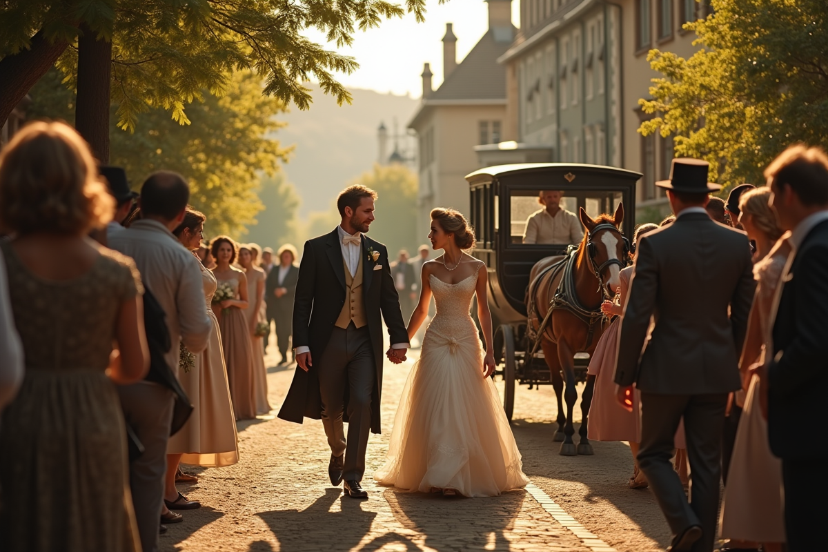 Jeune couple de mariés élégants du XIXe siècle se tenant par la main devant une calèche